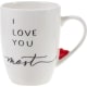 Keraaminen valkoinen muki, jossa teksti "I love you most". Kahvan alakulmassa punainen sydän kuvio. Koko 8,3x10,5cm, tilavuus 350ml.