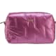 Violetti kiitäväpintainen kosmetiiikkalaukku neljällä sisätaskulla ja vetoketjulla.