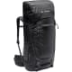 Kompressionsremmar på sidorna, fästöglor på locket, avtagbar bottendelare och en rullförankringspunkt. Bröstrem med utropstecken, hål för vätskesystem och information om alpina nödsituationer på huvuddelen.